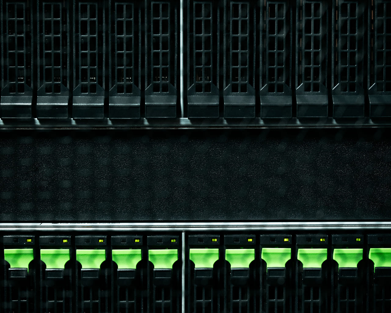 Close-up of stacked server racks with hexagonal ventilation patterns in a data center.